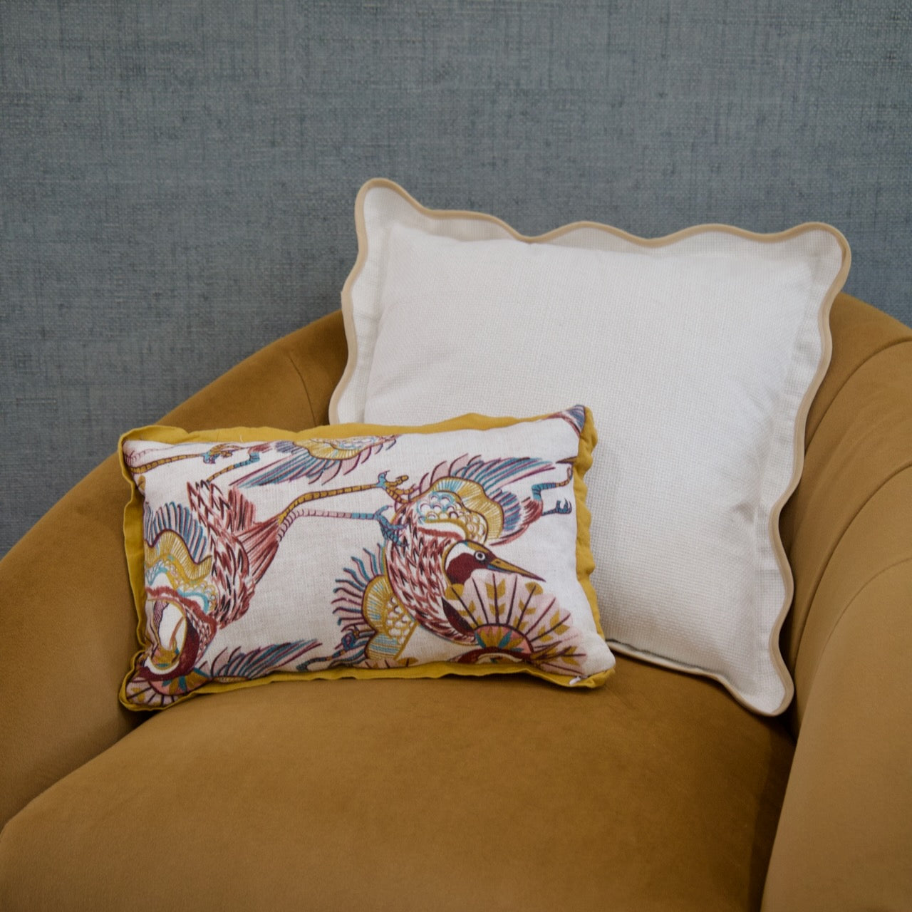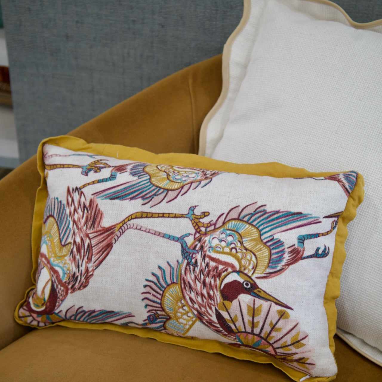 Handmade Decorative Pillow – Embroidered Cranes with Mustard Yellow Piping